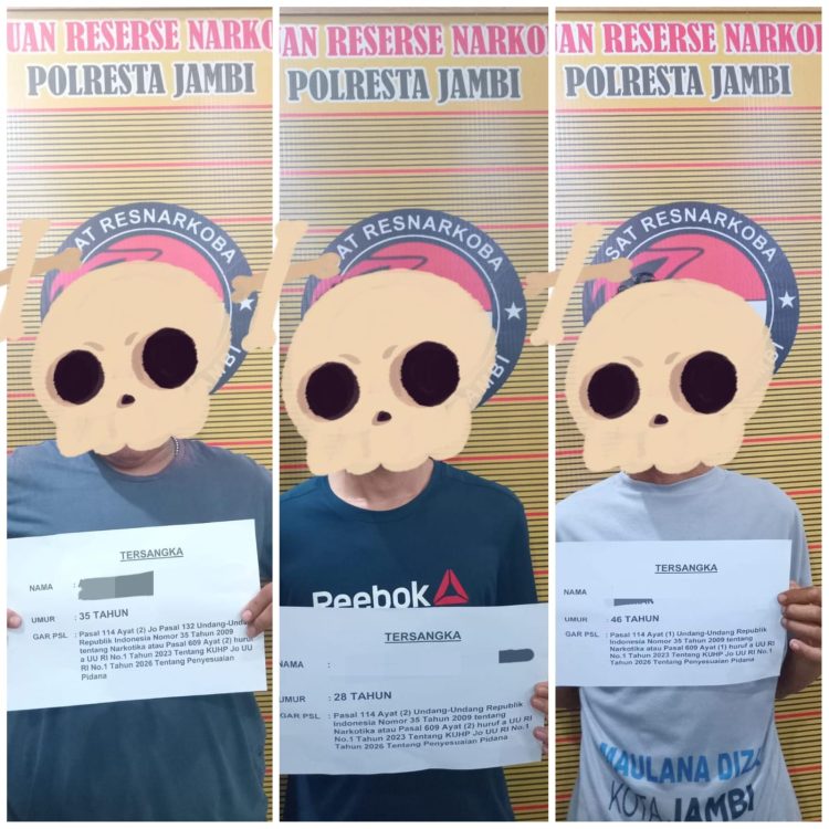 Kapolresta Jambi Kombes Pol Boy Sutan Binanga Siregar, S.I.K.,M.H. melalui Ps. Kasi Humas Iptu Edy Hariyanto, menyampaikan dan membenarkan; Penangkapan terhadap 3 orang pelaku tindak pidana Narkotika, berawal dari informasi masyarakat pada Rabu (22/4/2026) mengenai adanya aktivitas transaksi dan penyalahgunaan Narkotika jenis sabu di jln. Amangkarut Kel. Tanjung Pinang Kec. Jambi Timur. Berbekal informasi tersebut Tim Idik 2 bergerak cepat melakukan penyelidikan pada lokasi, sekira pukul 03.00 wib Tim Idik 2 berhasil melakukan penindakan penangkapan terhadap 3 (dua) orang laki-laki mengaku berinisial N, AJP dan YR, saat dilakukan penggeledahan ditemukan barang bukti sebanyak 56 (lima puluh enam) paket klip bening diduga berisikan Narkotika jenis sabu, dengan rincian; 55 (lima puluh lima) paket tersimpan di kotak plastik merk QKZ yang sempat dibuang ke lantai oleh pelaku N, dan 1 (satu) paket ditemukan didepan YR saat berada dalam kamar.